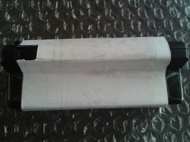 まず、ビーコンユニットは、下記のように「白い用紙で包んで」います。これは、A4用紙を縦に2つに折り、そしてカットしたものを更に幅を2cm程度カットして、1周ほど巻き、そして透明PHPテープで包んでいます。