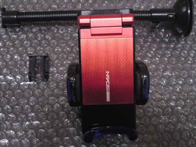 これが商品の中身になるのですが、左上が、真空吸盤で貼れない場所用のアダプター両面テープ付き、右上が真空吸盤、右下が携帯電話をセットするホルダー、左下はなにかのアダプターでよくわかりません。