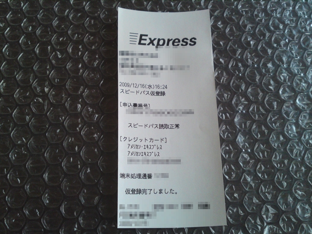 上記は、スピードパス申込書に必須事項を書いて、登録したいクレカと一緒に係員の人に渡すと、「カードの認証手続き完了証明書」なるものと一緒に返却されてきます。そして「登録完了のはがきが自宅に届きますので、それが1週間くらいだと思いますが、はがきが届けばスピードパスが使用できますよ」と笑顔の素敵な女性係員さんに言われました。